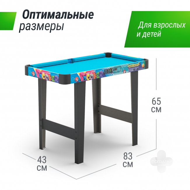 Представляем вам уникальный стол UNIX Line Трансформер 4 в 1, 86х43 cм, который объединяет четырепопулярных игры в одном компактном и стильном дизайне! Этот стол - идеальное решение для всех любителей аэрохоккея, настольного футбола, бильярда и настольного тенниса. Вы можете менять 4 поля и играть в разные игры. Стол трансформер предлагает вам насладиться игрой в хоккей. Ощутите адреналин и динамичность, пытаясь забить шайбу в ворота противника. Быстрые движения, точность и реакция - все это станет вашими лучшими помощниками в достижении победы. В комплекте идут 2 биты и 2 шайбы. Одно из полей – поле для настольного футбола. Знаменитой и любимой игрой многими детьми и взрослыми. Кикер оснащен плавными и точными игровыми фигурками, которые позволяют вам контролировать мяч и создавать захватывающие комбинации. Высота игроков 11 см, мяч 3,5 см. Все фигурки изготовлены из пластика. Также на столе можно играть в настольный мини бильярд, он не только развлекает, но и развивает навыки стратегического мышления, точности и координации движений. Бильярд - это отличный способ провести время с друзьями и семьей, создавая незабываемые моменты и конкуренцию. К полю мини бильярда в комплекте идут 2 деревянных кия и шары. И наконец, стол трансформер может быть использован для игры в пинг-понг. Отточите свои навыки и технику, соревнуясь с семьей и друзьями. Настольный теннис - это игра, которая развивает координацию, реакцию и концентрацию, со столом трансформером вы сможете наслаждаться игрой в любое время. В комплекте идут 2 ракетки, сетка и шарик для игры. К каждому из 4 полей в комплекте идут необходимые аксессуары для игры, чтобы вы сразу могли насладиться новым универсальным столом трансформером! Стол трансформер обладает прочной конструкцией, которая обеспечивает стабильность и долговечность. Компактные размеры и легкость в установке столов позволяют вам легко менять поля и наслаждаться разными играми дома или в офисе. Складная конструкция игрового стола трансформера позволит перемещать его по комнате или брать с собой на пикник или в поездку. Будьте готовы к бесконечным часам веселья и развлечений!